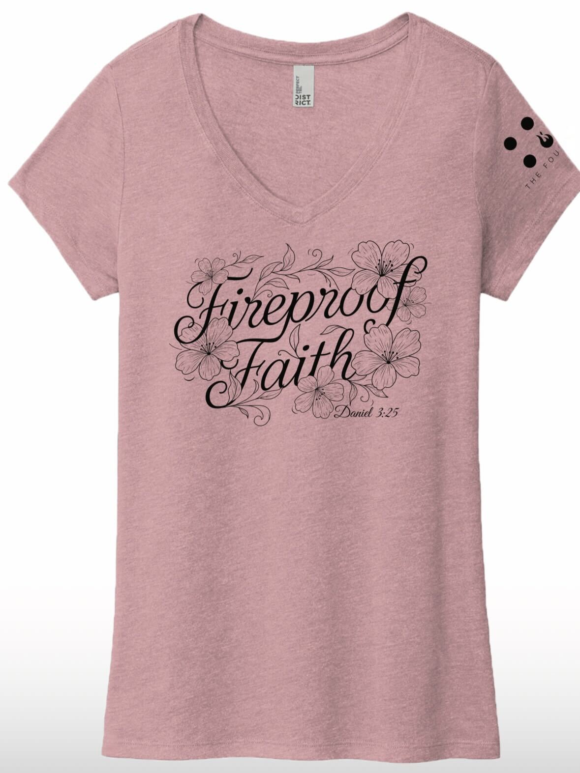 Pink tee featuring floral "Fireproof Faith, Daniel 3:25" on the front, and T4 logo on left sleeve.